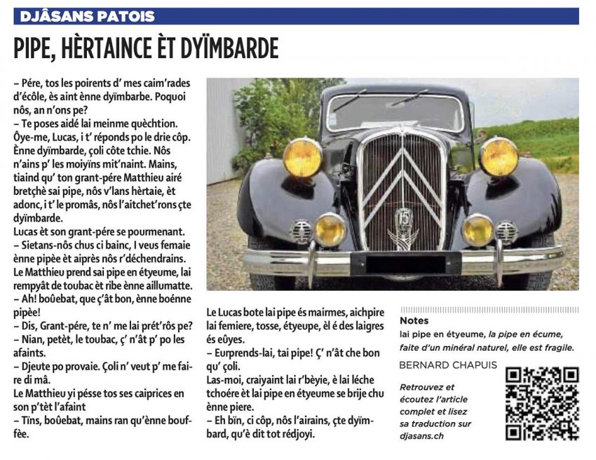 Te poses aidé lai meinme quèchtion. Ôye-me, Lucas, i t’ réponds po le drie côp. Ènne dyïmbarde, çoli côte tchie. Nôs n’ains p’ les moiyïns mit’naint. Mains, tiaind qu’ ton grant-pére Matthieu airé bretçhè sai pipe, nôs v’lans hèrtaie, èt adonc, i t’ le promâs, nôs l’aitchet’rons çte dyïmbarde.
