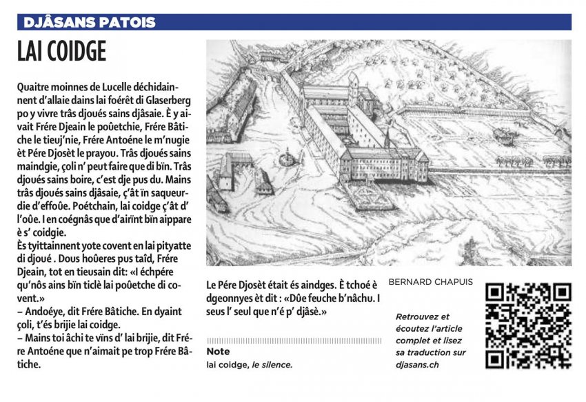 Quaitre moinnes de Lucelle déchidainnent d’allaie dains lai foérêt di Glaserberg po y vivre trâs djoués sains djâsaie. È y aivait Frére Djeain le poûetchie, Frére Bâtiche le tieuj’nie, Frére Antoéne le m’nugie èt Pére Djosèt le prayou. Trâs djoués sains maindgie, çoli n’ peut faire que di bïn. Trâs djoués sains boire, c’est dje pus du. Mains trâs djoués sains djâsaie, ç’ât ïn saqueurdie d’effoûe. Poétchain, lai coidge ç’ât d’ l’oûe. I en coégnâs que d’airïnt bïn aippare è s’ coidgie.
